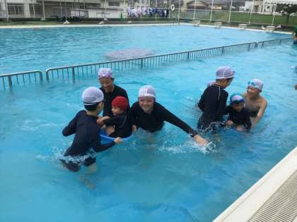 7/10、1年生と6年生は、「一六(いちろく)交流」を行いました。これは、6年生が1年生と仲良くなるために、企画した会です。今回はプールで、「シロクマのジェンガ」と「たらいレース」を行いました。
