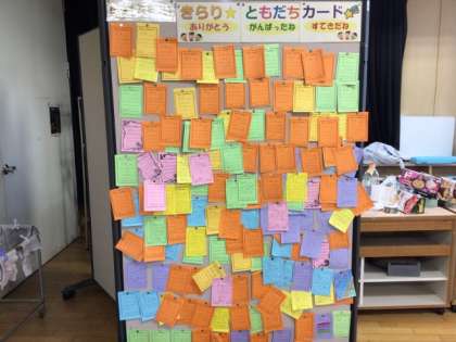伊保小学校には、「きらり☆ともだちカード」があります。これは、他学年のお友達の活躍を認めたり、感謝のことばをおくったりしています。