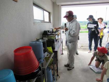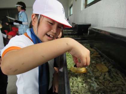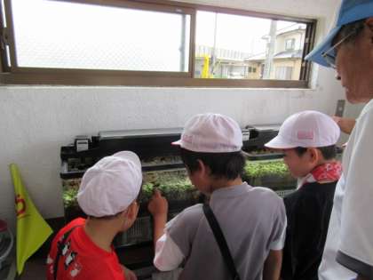 続いてゲンジ蛍の幼虫のえさとなる「カワニナ」について教えていただき、観察をしました。カワニナのえさは、なんとジャガイモです。
