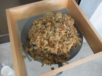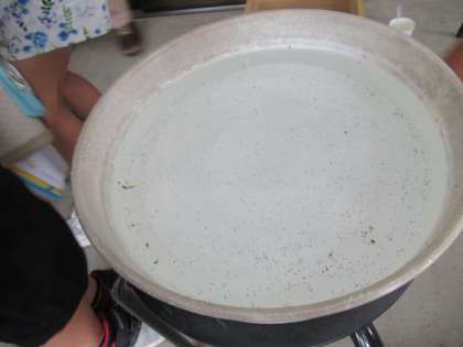水草に生みつけられた卵から孵化した幼虫は、下の白い洗面器に落ちるそうです。小さな小さな命を観察しました。
