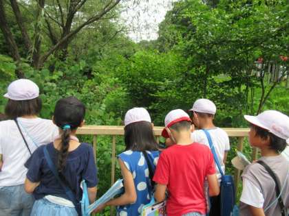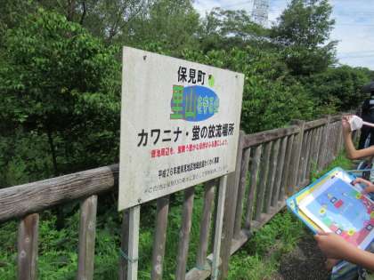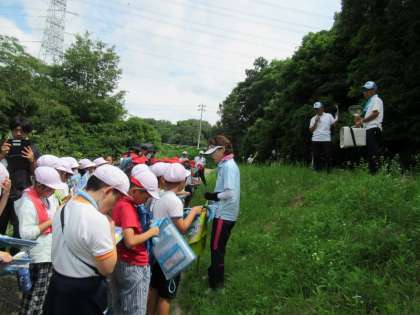 保全会の方が毎年蛍の幼虫を放流している池のほとりで、蛍の生息域についての説明をいただきました。子どもたちは、聞いたことをワークシートにメモしていました。
