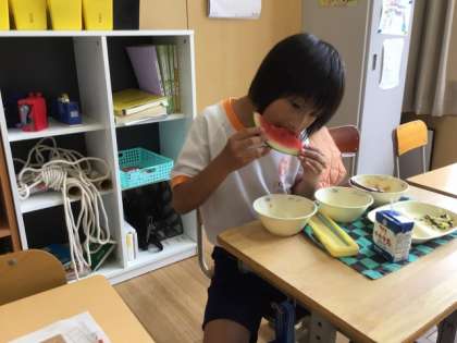 暑い中、冷たく冷えたスイカに、児童は大喜びでした。