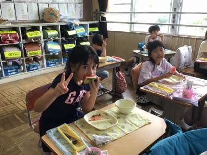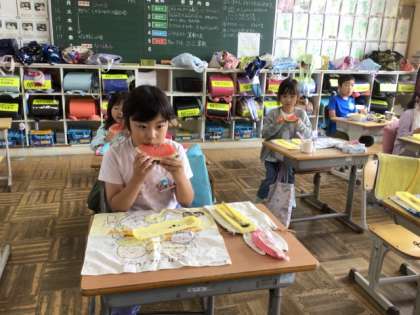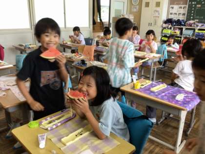 今年は、ハクビシンと思われる野性動物に、できたスイカの半分弱を食べられてしまいました。児童は、それを担任の先生から聞き、悔しいけれど、それも自然の中であり得ることなんだと学びました。