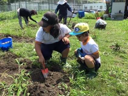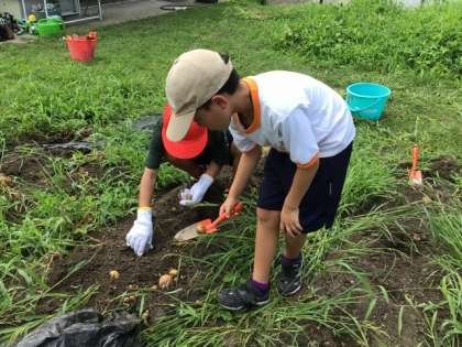 特別支援学級は、昨年度の冬に学校の畑にジャガイモを植えました。7/18に、児童みんなでジャガイモほりをしました。