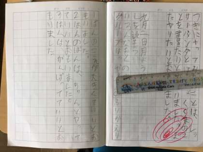 9/2の学習では、「いろんな おとの あめ」をグループで朗読練習をして、クラスでグループごとに発表をしました。聞いている児童は、発表のようすについて、ノートに感想を書きました。