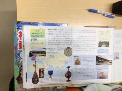 9/3の授業では、教科書に載っているシルクロードを通して、数千キロも離れたところから様々な文化が日本に伝わったことを学習しました。また、進んだ中国の文化を学ぶために、「遣唐使」を送って、日本の人々が積極的に学んでいたことを知りました。