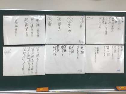 9/4の学習では、詩「いま始まる新しいいま」を読んで、「連」ごとに作者が伝えたいことについて、班で考え、ホワイトボードにまとめました。ホワイトボードを黒板に貼り、学級全体で作者の伝えたいことを考えました。
