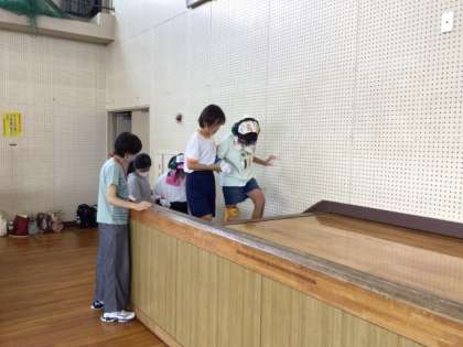 高齢者の動きに合わせた器具を装着した児童は、いつものように動くことができずに、四苦八苦していました。