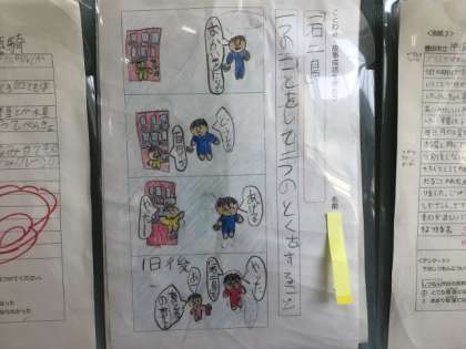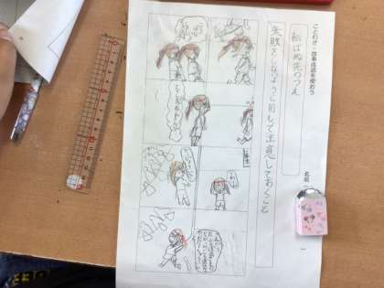 9/5の学習では、児童が気に入ったことわざ・故事成語を選び、意味や使い方を調べました。また、調べたことを、絵や漫画を使ってまとめ、掲示しました。とても分かりやすく、楽しいものができました。