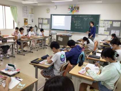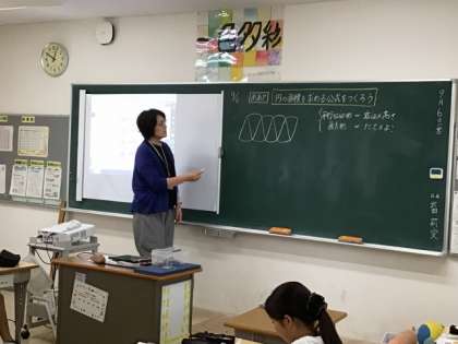 9/6の授業では、円を8等分して切り分けた「くし形」を組み合わせ、四角形に近い形にした図形から、円の面積の求め方を考えました。