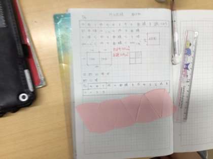「この底辺が、円周の半分だから、直径×3.14÷2だな」「直径×3.14÷2は、半径×3.14のことだね」「高さは半径になるね」と一つ一つ確認をしていき、最終的に「円の面積を求めるには、半径×半径×3.14」という公式にたどり着きました。