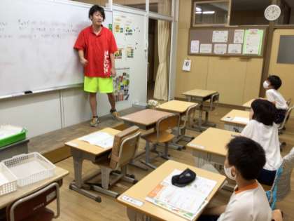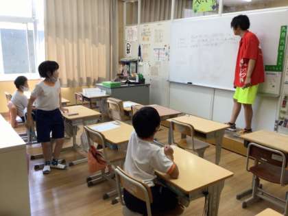 9/6の授業では、教室のホワイトボードに、「ぎょうざ」「シーラカンス」「きんようび」「ルビー」「ミッキーマウス」などたくさんの単語が書かれていました。それらのことばを、「『ン』を抜いて読むと?」「反対から読むと?」など、次々に担任が指示を出し、児童はすぐに反応して挙手をし、発音していました。