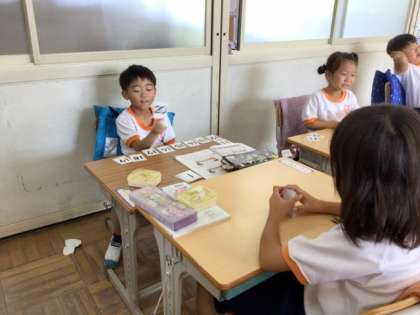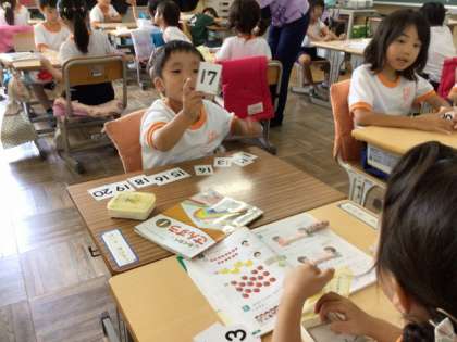 9/9の授業では、「18は10と8を合わせたかず」ということを学習したあと、ペアになって自分の机の上に、10〜20のカードを並べました。カードを1枚相手に見せて、ペアの子はそれに対して、「17は10と7をあわせたかずです」と、答えていました。