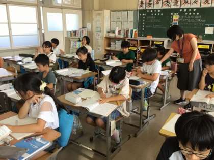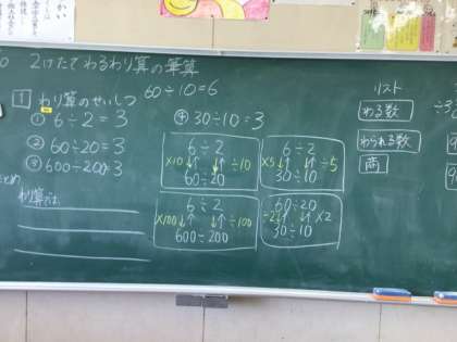9/10の学習では、6÷2 と 60÷20 と 600÷200 の答えが同じになることを確かめました。次に、両方の数を2倍したらどうか、5倍したらどうか、などを確かめ、商が同じになり、児童は驚きの声をあげていました。