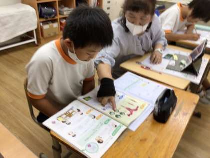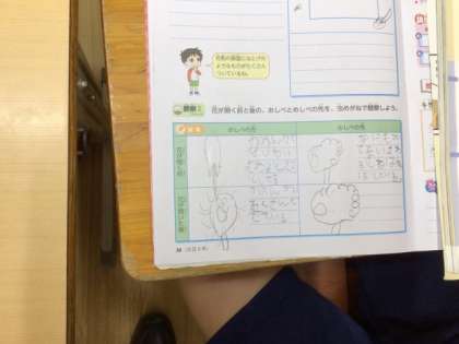 9/11の学習では、アサガオのおしべとめしべが、開花前と開花後でどのように変わるのかを調べ、ノートにまとめました。児童は教科書の写真を見てスケッチし、その特徴を書きました。
