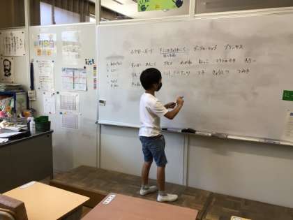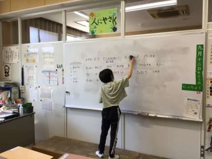 9/12の授業では、児童3人がしりとりをして、その言葉を担任がホワイトボードに書きました。担任は、ホワイトボードに書くときに、「ホワイトーボード」のように「ー」を間違えて書きました。