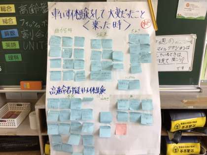 先週の学習では、「車いすや高齢者疑似体験をしてみて感じたこと」「介助者を体験して感じたこと」「町中で高齢者が困ると考えられること」の3つをそれぞれ考え、付箋に書いて模造紙に貼りました。