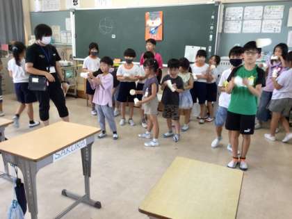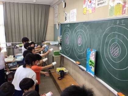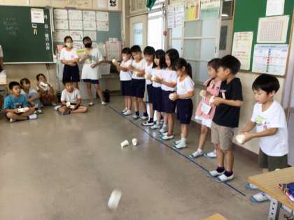 紙コップロケットができあがると、各班で遊びました。遊び方は、班ごとに6年生が考えました。