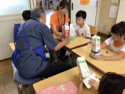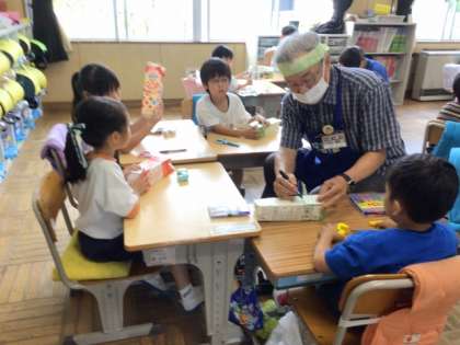 1年生児童は、まず、講師の先生からおもちゃの作り方を教わりました。おもちゃは、ゴムを使って動くおもちゃです。講師の先生が1班に1人ついてくださり、丁寧に教えてくださいました。