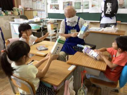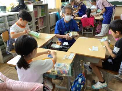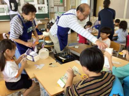 児童は、講師の先生に教えていただきながら、牛乳パックを切って組み合わせたり、紙皿の車輪を取り付けたりしました。