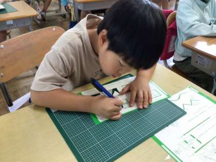 9/18の学習では、カッターナイフの安全な使い方について、学びました。カッターナイフの持ち方や手の添え方などを、プロジェクターに映った先生の見本を見て学びました。