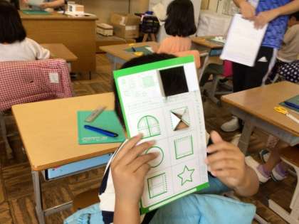その後、実際に紙を切ってみました。紙を切って折ると、窓のような空間がひろがりました。児童はうれしそうに、窓から向こう側を見ていました。