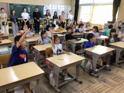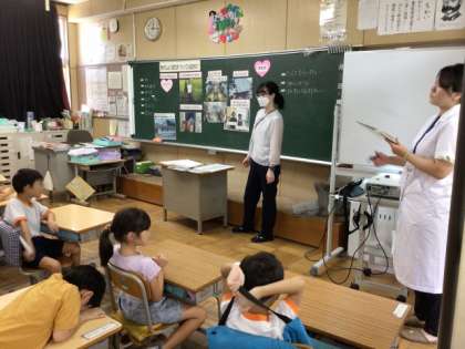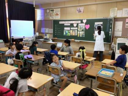 児童は、給食を作っている人の気持ちを想像して、「おいしい給食をつくりたい」「えいよういっぱいの給食を作りたい」「おいしくなるように、いっしょうけんめいに混ぜる」などと答えていました。