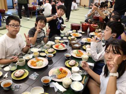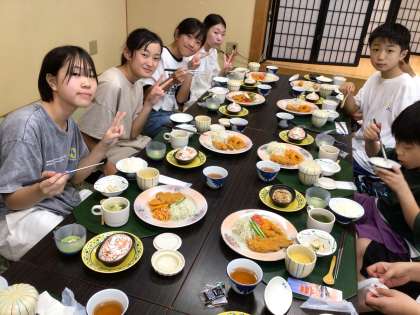 カツやイカのフライ、サラダ、茶碗蒸し、グラタン、スープ、抹茶ムースの豪華な食事を、楽しい会話とともにいただきました。