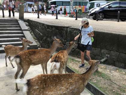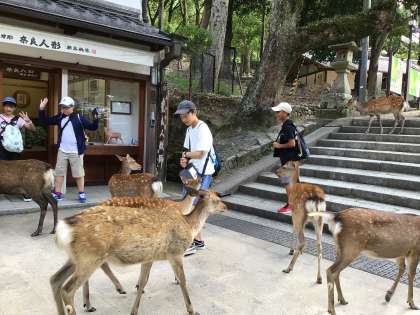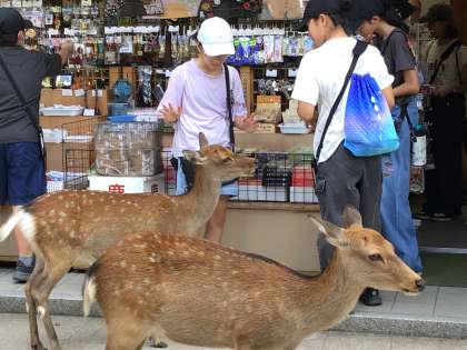 鹿せんべいを手にした途端、近づいてくる鹿たちに圧倒される場面もありました。