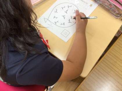 特別支援学級3年生の、9/25の国語の授業では、正しいひらがなの中に隠れた「間違ったひらがな」を探す学習をしていました。これは、文字の正しい形を認識するとともに、たくさんの文字から適切ではないものを選ぶことを通して、集中力のトレーニングにもなっています。児童は、「これだ!」と、間違ったひらがなを探し出していました。