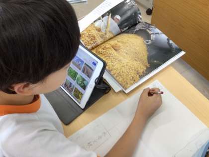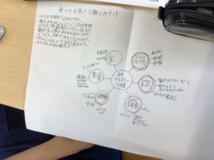 9/25の学習では、前時までに調べた「みそ」についてのウェビングマップをもとに、みそ新聞を作り始めました。豊田市中央図書館からお借りしたみそに関する本やインターネットを使って調べたことをもとに、記事を書いていました。