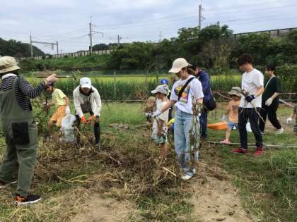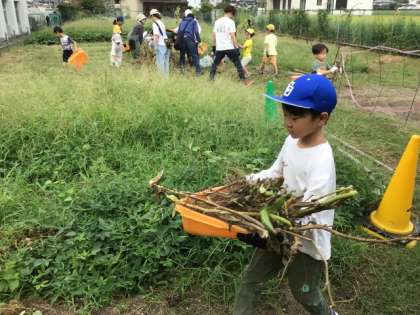 校舎の裏にある学校の畑も、きれいにしました。抜いた野菜の株などを、運び出しました。
