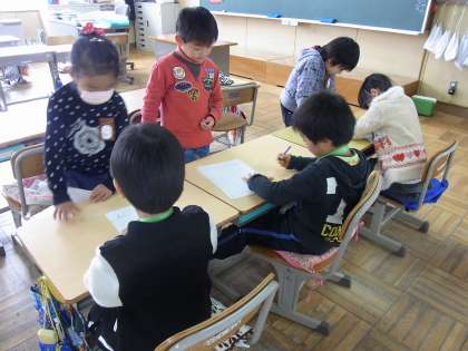 鉛筆の正しい持ち方を説明して実際にひらがなの書き方を教える班,掃除の時のほうきの使い方を教える班,音楽の授業で習った楽器の演奏の仕方を教える班など,それぞれが工夫をこらして,じょうずに説明していました。新入学児にとっては,学校生活について知るよい機会となり,学校での生活に対する意識を高めたようでした。また,説明する側の1年生にとっても,説明の仕方を工夫する力を高めるとともに,まもなく上級生になるのだという自覚を高めたようでした。
