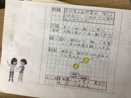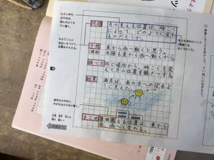 最初の1マスをあけたり、四角やわくで囲んだり、見出しをつけたりすると見やすいノートになることを学びました。さっそくお手本を見ながら、書いてみました。