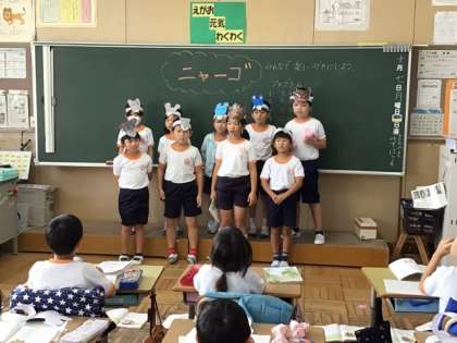 10/7の授業では、各班の発表会を行いました。ニャーゴやネズミのお面をかぶり、登場人物になりきって、朗読劇を行いました。