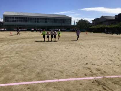 次に、運動場の真ん中に出て、本番と同じコースで競い合いました。上級生は下級生を思いやりながら、棒を持って走り抜けていました。