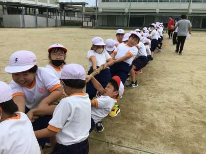 まず、綱引きの練習を行いました。入場の確認をして、実際に3回勝負を行いました。先日行った練習よりも、児童は腰を低くして引き合っていました。