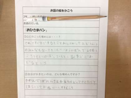 2年生の図工では、読書感想画に入りました。2年生の題材は、「おひさまパン」という絵本です。