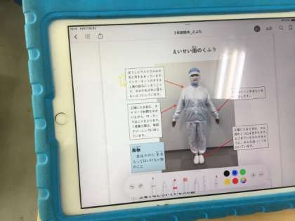 10/17の授業では、副読本「とよた」を使って、シュークリーム工場ではたらく人の工夫について、学習しました。「とよた」に載っている本文から、「ほこりを防ぐために、ローラーの粘着テープで何回もほこりを取っている」と、見つけたことを発表していました。