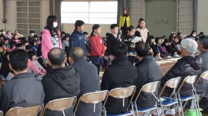 2月20日に,地域の方に感謝する会がありました。参加された地域の方は,スクールガードの皆さん,交通指導員の皆さん,伝統芸能講師の皆さん,花を学校へ寄贈してくださった皆さん,授業で子どもたちがご指導を受けた皆さん方です。今年お世話になったことを,子どもたちが,お礼の言葉や歌,感謝状などのプレゼントで,感謝の気持ちを表しました。また,会の中でPTAの代表の方が,保護者を代表して感謝の言葉を述べられました。