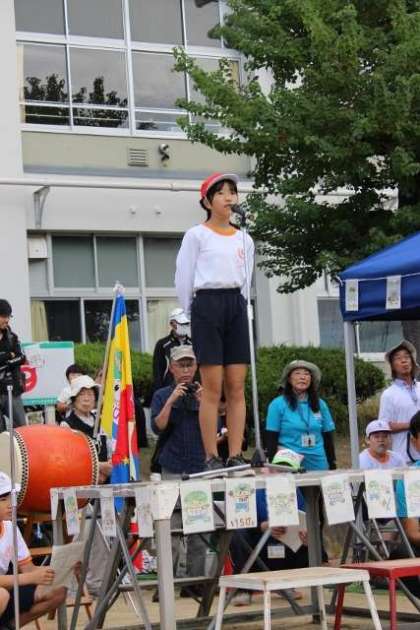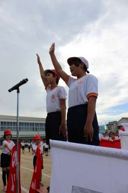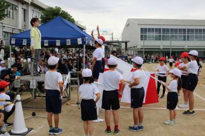 児童代表や校長先生のお話の後に、選手宣誓がありました。全クラスの代表者が旗を持って集まり、気持ちを一つに宣誓しました。