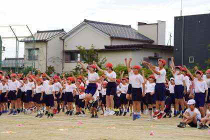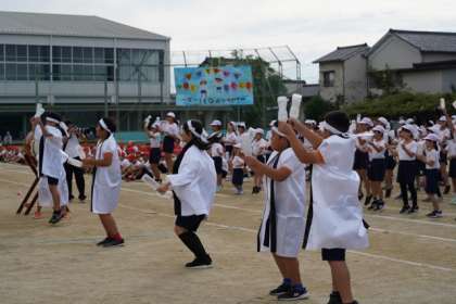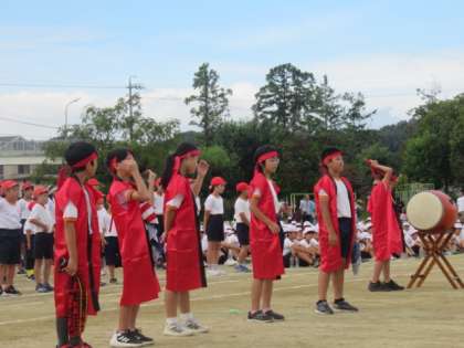 開会式の後に、応援合戦を行いました。全校児童が赤と白に分かれ、ここまで練習をしてきました。勝利をめざして、自分のチームを鼓舞しました。団長の掛け声と太鼓のリズムが、格好良かったです。