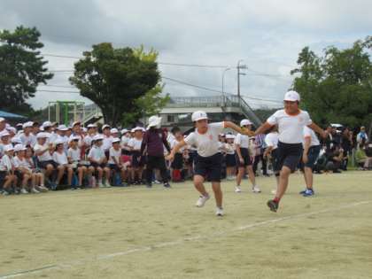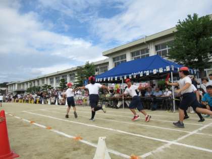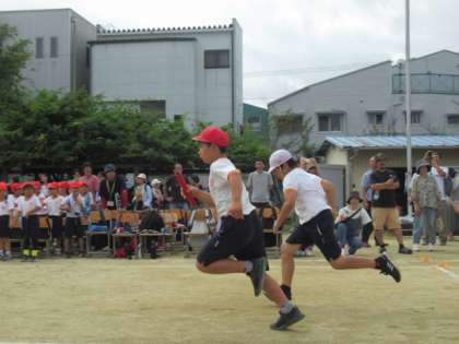 プログラム3は、5・6年生による、紅白対抗全員リレーでした。赤白ともに2チームずつの4チームで競いました。