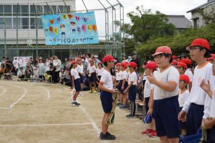 運動場を駆け抜けるチームに、赤白の応援団が大きな声援をおくっていました。