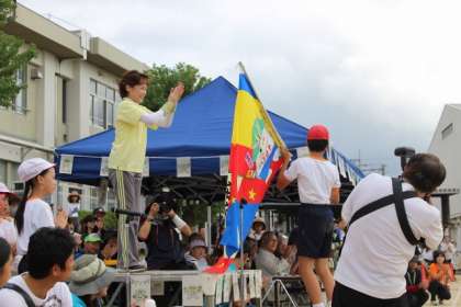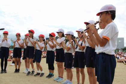 閉会式では成績発表があり、赤が勝ちました。いぼりんフラッグが赤組に授与されました。応援の部三部門は、白組がとりました。表彰式ではなんと、6年生リコーダーの生演奏がありました。