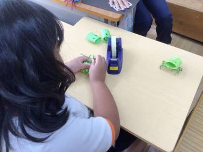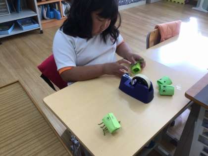 10/22の自立活動の授業では、3年生がクモの飾りを作っていました。「クモの足は8本だよ」と言いながら、足を胴体につけていました。