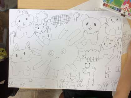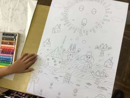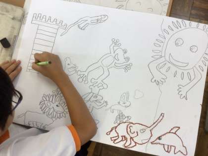 担任の先生が伝わりやすい構図を説明し、それを聞いた児童は、画面いっぱいに登場人物を描いて、とても楽しい絵ができていました。