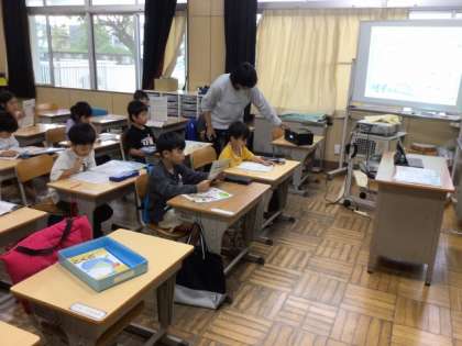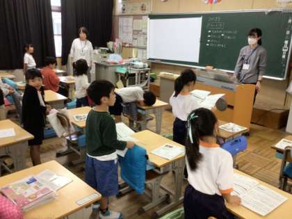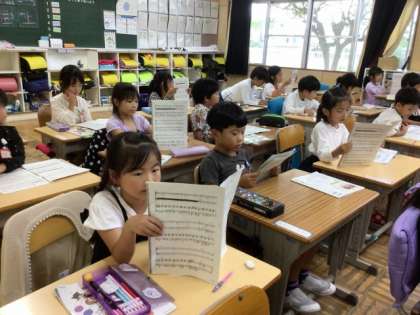 10/23の授業では、1年生児童がゆっくりゆっくりと音とりをしていました。全校児童が高音パートと低音パートに分かれるため、高音の1年生がどこを歌ったらよいか、楽譜を見ながら説明を聞きました。