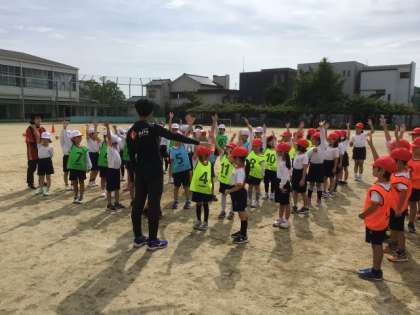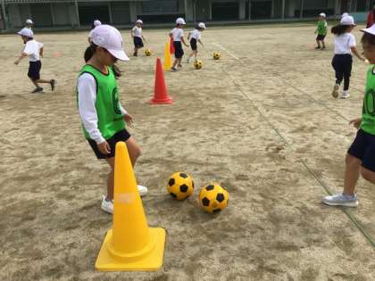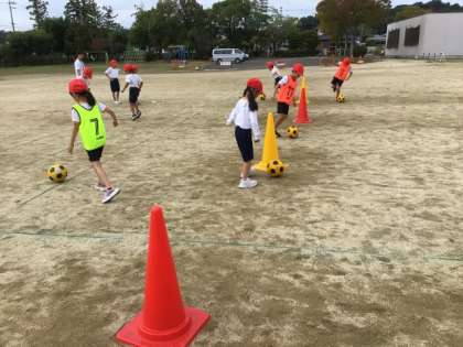 2年生も、ドリブルの仕方を教わりました。10mほど先にあるコーンまでドリブルし、コーンを回って次の子にボールをパスしていました。