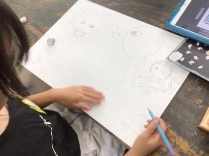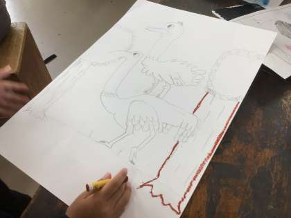 10/25の4年生の授業では、下書きを行いました。4年生の題材は、「かたあしダチョウのエルフ」です。児童の絵には、いきいきとした動物が描かれていました。